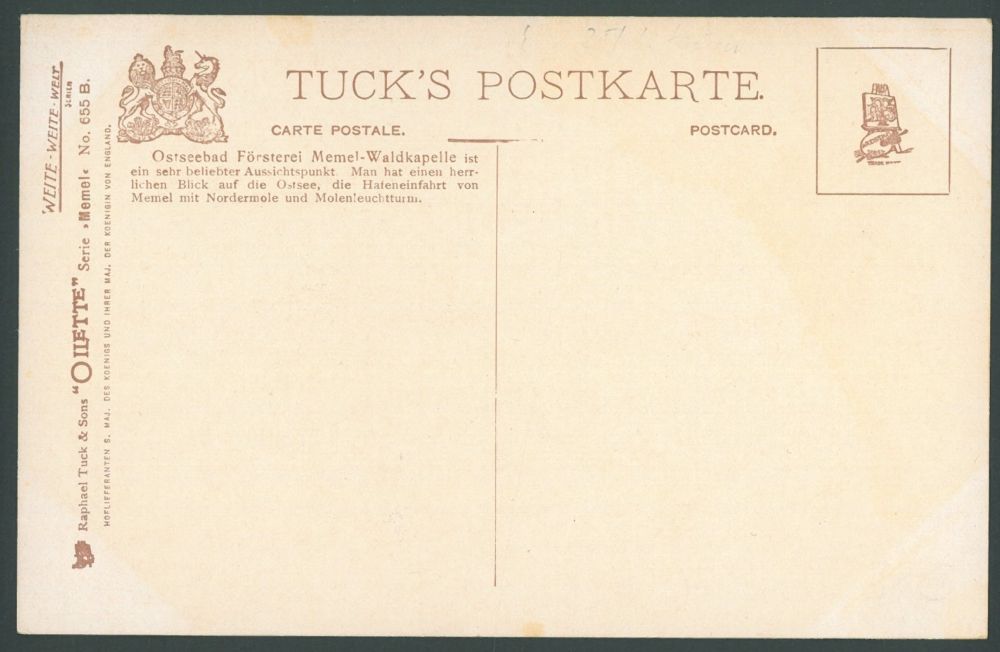 OILETTE Serija Memel Nr. 655B Atviruko tekstas: Baltijos jūros kurorto Girulių miško koplyčia yra labai mėgstamas apžvalgos taškas. Iš čia atsiveria puikus vaizdas į Baltijos jūrą, Memelio uosto įplauką su šiauriniu molu ir molų švyturiu.